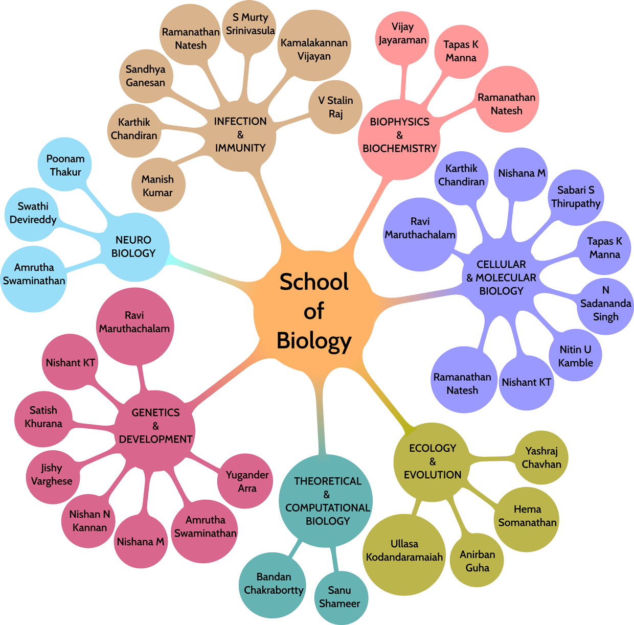 Research in the School of Biology spans all scales from single molecules all the way up to ecosystems. Although the bulk of the research is driven by PhD students and postdoctoral fellows, several major and minor projects done by IISER TVM BS-MS routinely translate to publications in peer-reviewed journals co-authored by the students. The following are the broad research areas in the school. You can click through the nodes in the image below, or scroll down for more detailed information.